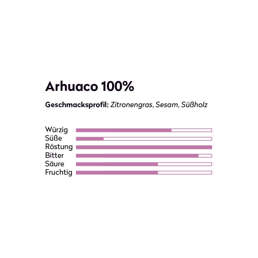 Arhuaco 100%: Der kräftig dunkle Kakaogeschmack mit Noten von süßen Gewürzen, Zitronengras, Sesam und Süßholz prägt diesen seltenen indigenen Businchari Kakao aus besonderen weißen Bohnen. Kakaoanteil 100%. From Bean to Bar.