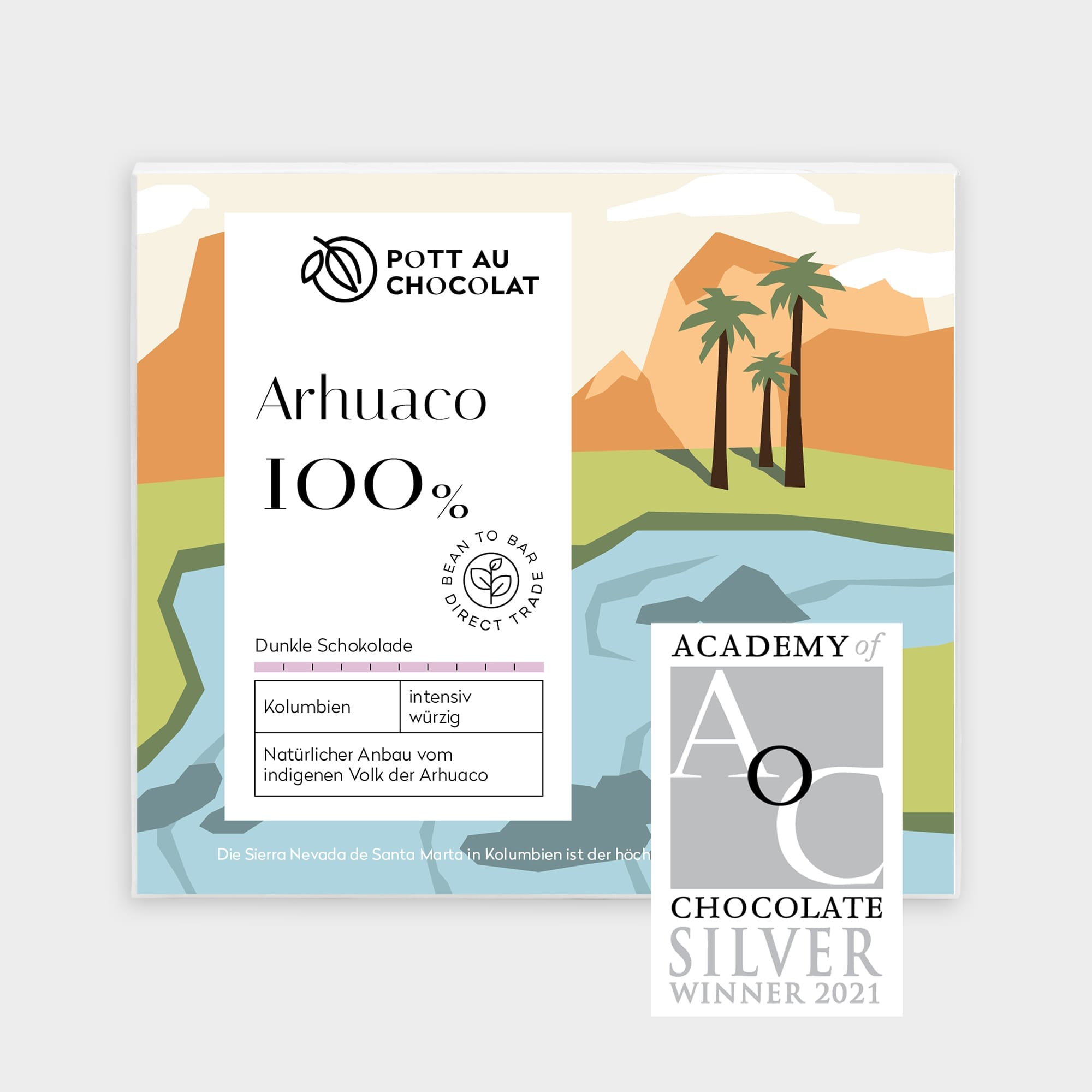 Arhuaco 100% ist eine sehr milde Schokolade ohne jegliche Zusätze. Kakao pur in seiner reinsten Form.