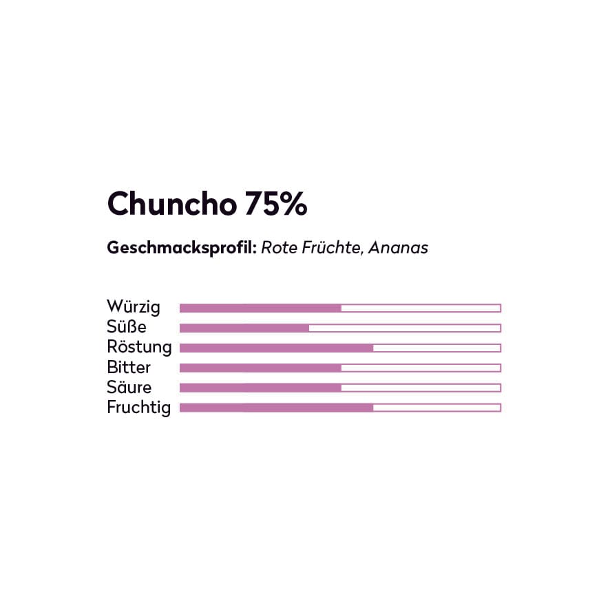 Unsere Tafel Chuncho Kakao 75% ist eine wahre Geschmacksexplosion. Sie beginnt mit einer samtigen Textur, die sich langsam auf der Zunge entfaltet. Der erste Eindruck ist von einer angenehmen Bitternote geprägt, die jedoch bald von einer reichen Palette anderer Aromen begleitet wird. Du kannst subtile Noten von roten Beeren, Zitrusfrüchten und vielleicht sogar einen Hauch von Honig oder Malz wahrnehmen. Im Abgang enthüllt sich eine florale Note, begleitet von einem Hauch von Nüssen und einer angenehmen, langanhaltenden Wärme.