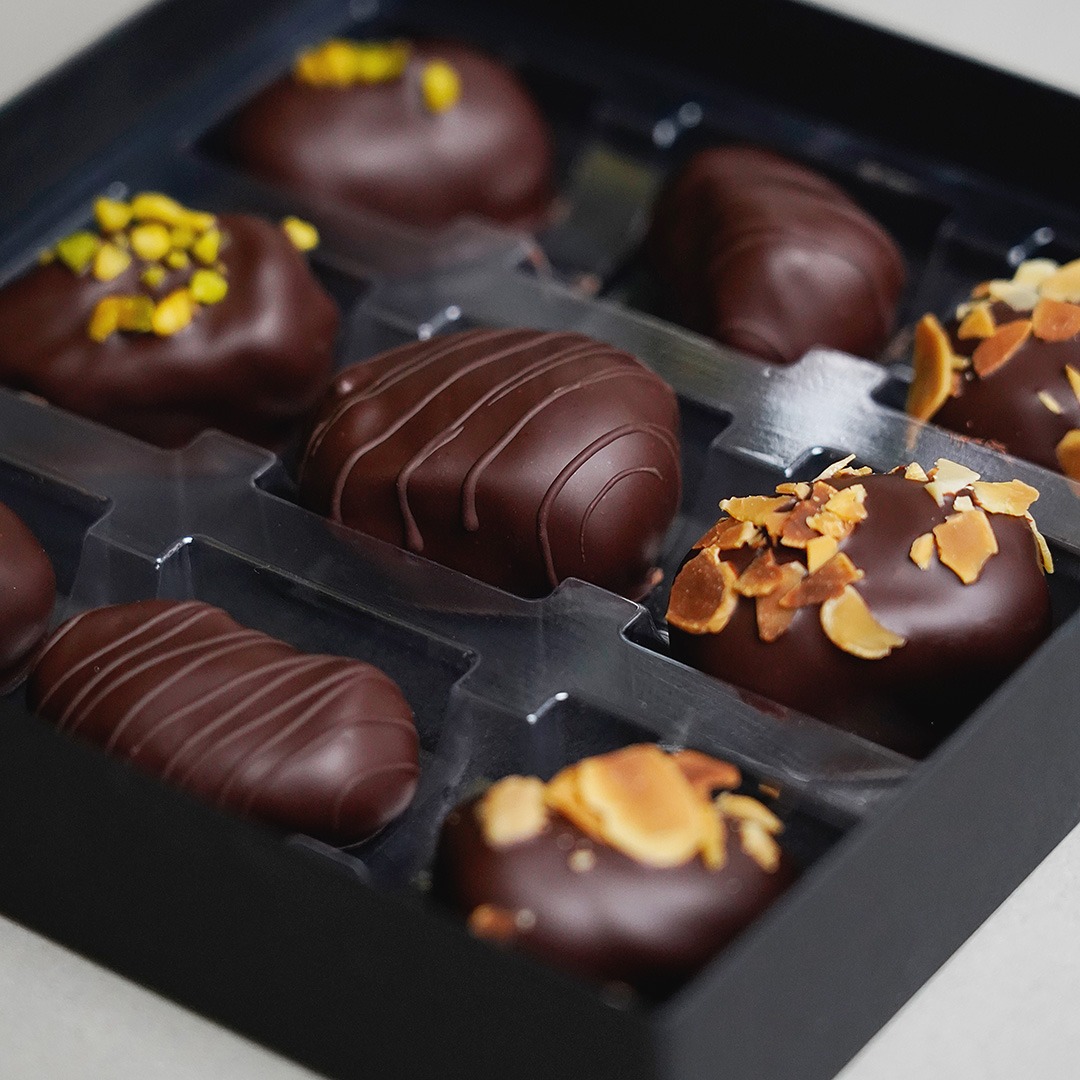 Jede Dattel wird von Hand gefüllt, mit Schokolade überzogen, dekoriert und verpackt. Diese Sorgfalt macht unsere Schoko-Datteln zu einer Spezialität, die man schmeckt – und die sich deutlich von industrieller Massenware abhebt.