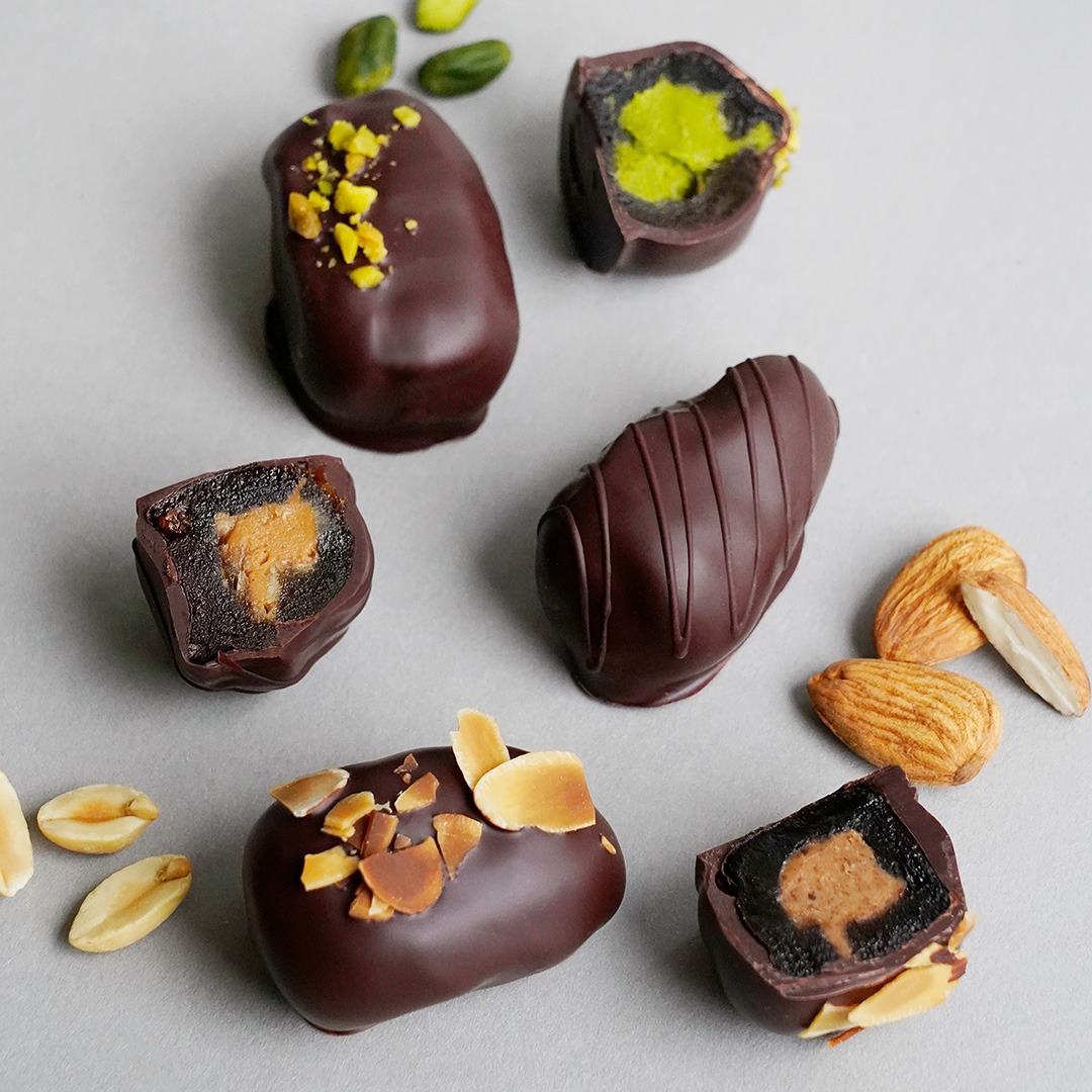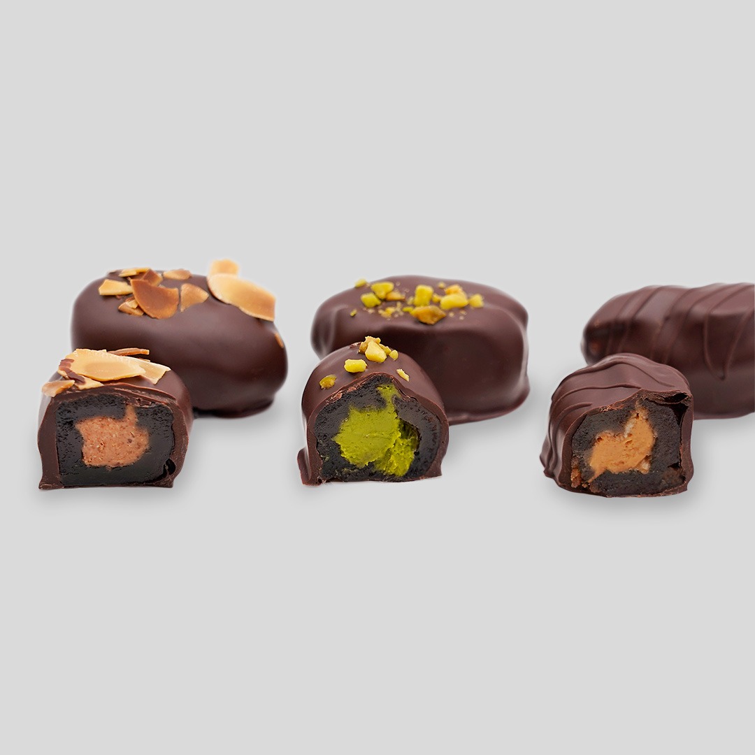 Unsere Schoko-Datteln mit Nussfüllung gibt es in drei köstlichen Varianten: