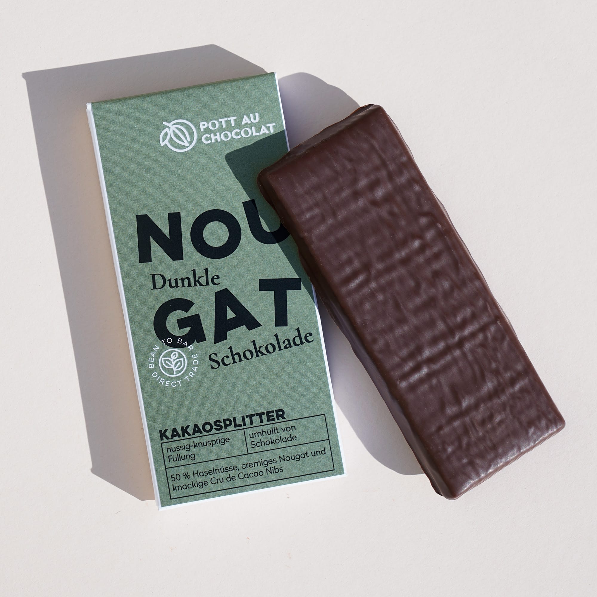 Ein weiteres Highlight in unserem Schoko-Riegel sind die Cru de Cacao Nibs (Kakaosplitter), die dem cremigen Nougat eine angenehme Knusprigkeit verleihen. Diese Kakaosplitter stammen aus hochwertigen, ungerösteten Kakaobohnen und bieten ein unverfälschtes Kakaoerlebnis. Sie sind leicht bitter und enthalten keinen zusätzlichen Zucker, was sie zu einer perfekten Ergänzung zur süßen und nussigen Füllung macht.