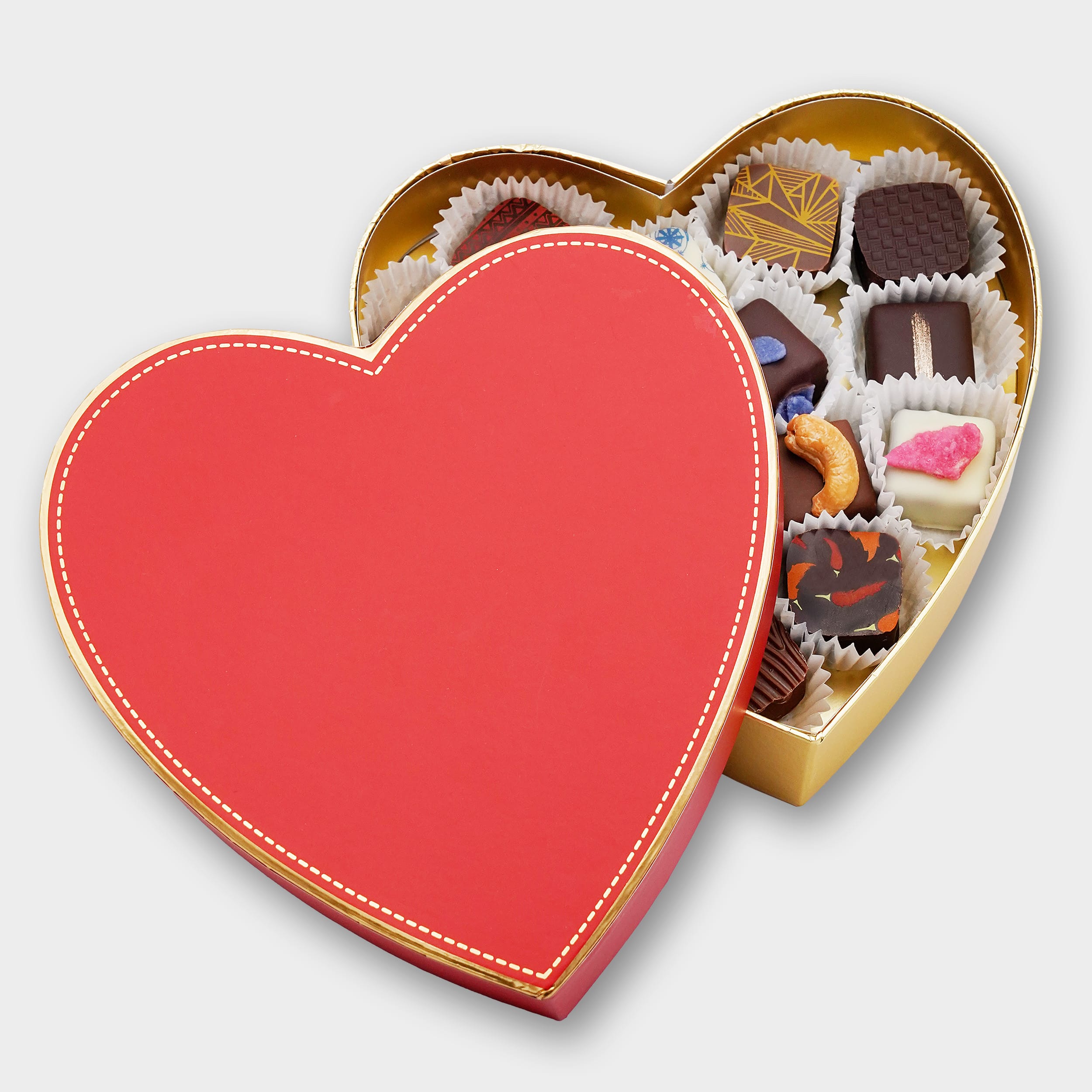 Unsere Pralinen stehen für höchste Qualität und handwerkliche Kunst. Jede einzelne Praline wird frisch hergestellt, um ein unvergessliches Geschmackserlebnis zu bieten. Die herzförmige Schachtel in leuchtendem Rot mit einem goldenen Boden ist nicht nur eine Augenweide, sondern verleiht jeder Praline einen Hauch von Luxus. In dieser Box vereinen sich Genuss, Liebe und das perfekte Geschenk in einer edlen Verpackung.