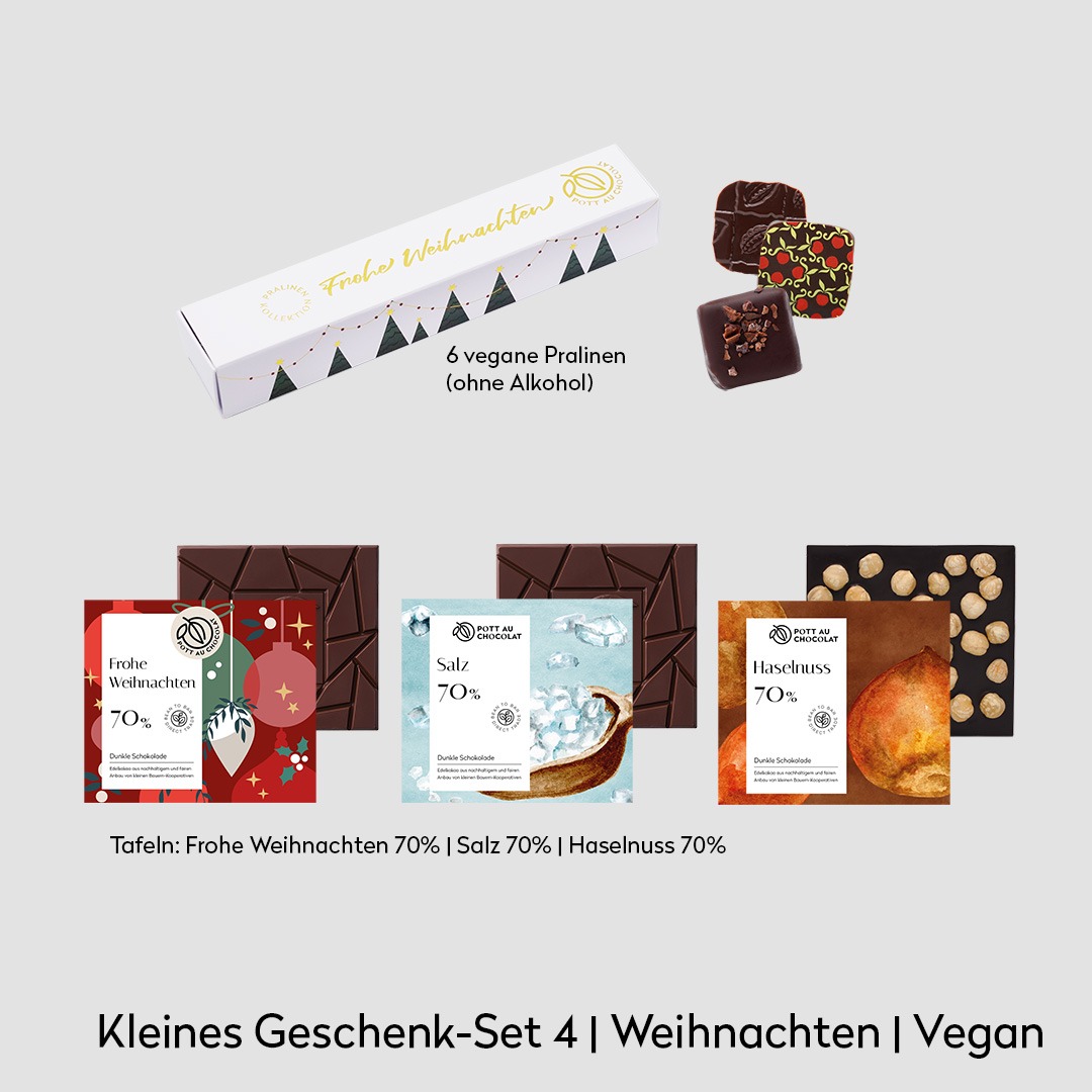 - Haselnusstafel (bei 3 Tafeln): dunkle Schokolade mit Haselnüssen – intensiv, vegan und festlich zugleich.