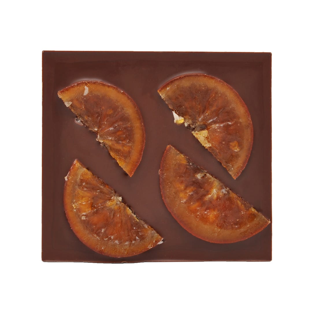 49 % Milchschokolade belegt mit glasierten Orangen – ein Genuss für alle Sinne
