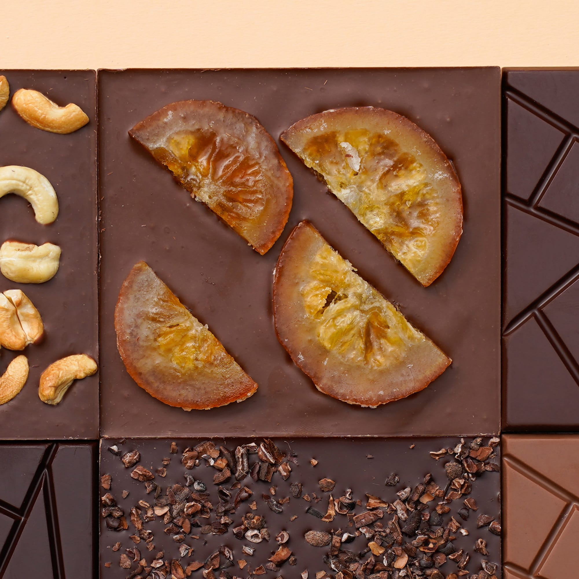 Unsere 49 % Milchschokolade zeichnet sich durch feine Noten von Sauerkirsche, Datteln und roten Früchten aus, die dem Kakao eine besondere Tiefe verleihen. Diese Aromen entfalten sich in jedem Bissen und werden durch die fruchtige Frische der glasierten Orangen ergänzt.