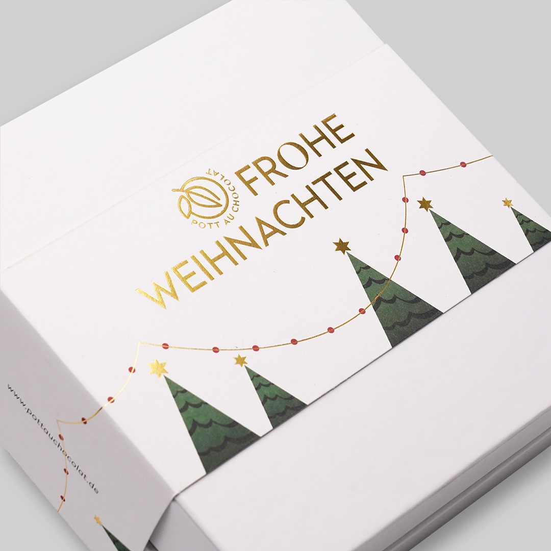 Schon das Äußere unserer Pralinen Geschenkbox Weihnachten ist ein Versprechen: Eine hochwertige Verpackung mit weihnachtlichen Motiven, goldener Prägung und feinen Details macht sie zu einem echten Hingucker unter dem Weihnachtsbaum.