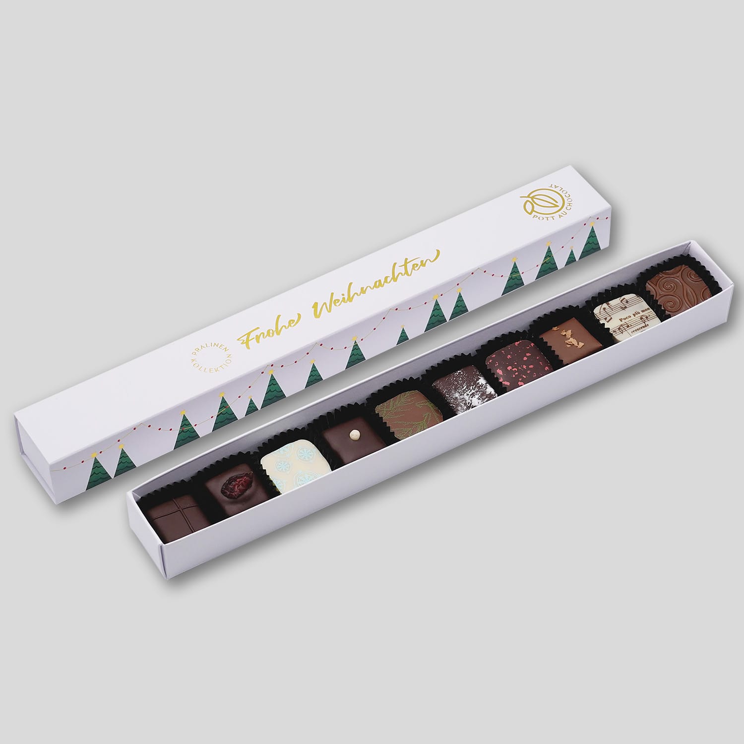 Die Pralinen-Stange (10er) kommt in einem festlichen Schuber daher, der mit grünen und goldenen Akzenten gestaltet ist und mit weihnachtlichen Illustrationen. Dieser Schuber macht sie zu einem schönen Geschenk, das sofort ins Auge fällt und für Vorfreude sorgt. Die Kombination aus edlem Design und hochwertigem Inhalt macht sie zu einer wunderbaren Aufmerksamkeit, die sowohl optisch als auch geschmacklich begeistert. Egal, ob als Geschenk für die Familie, Freunde oder Kollegen – die Pralinen-Stange vermittelt sofort ein Gefühl von festlicher Eleganz und besonderer Wertschätzung.