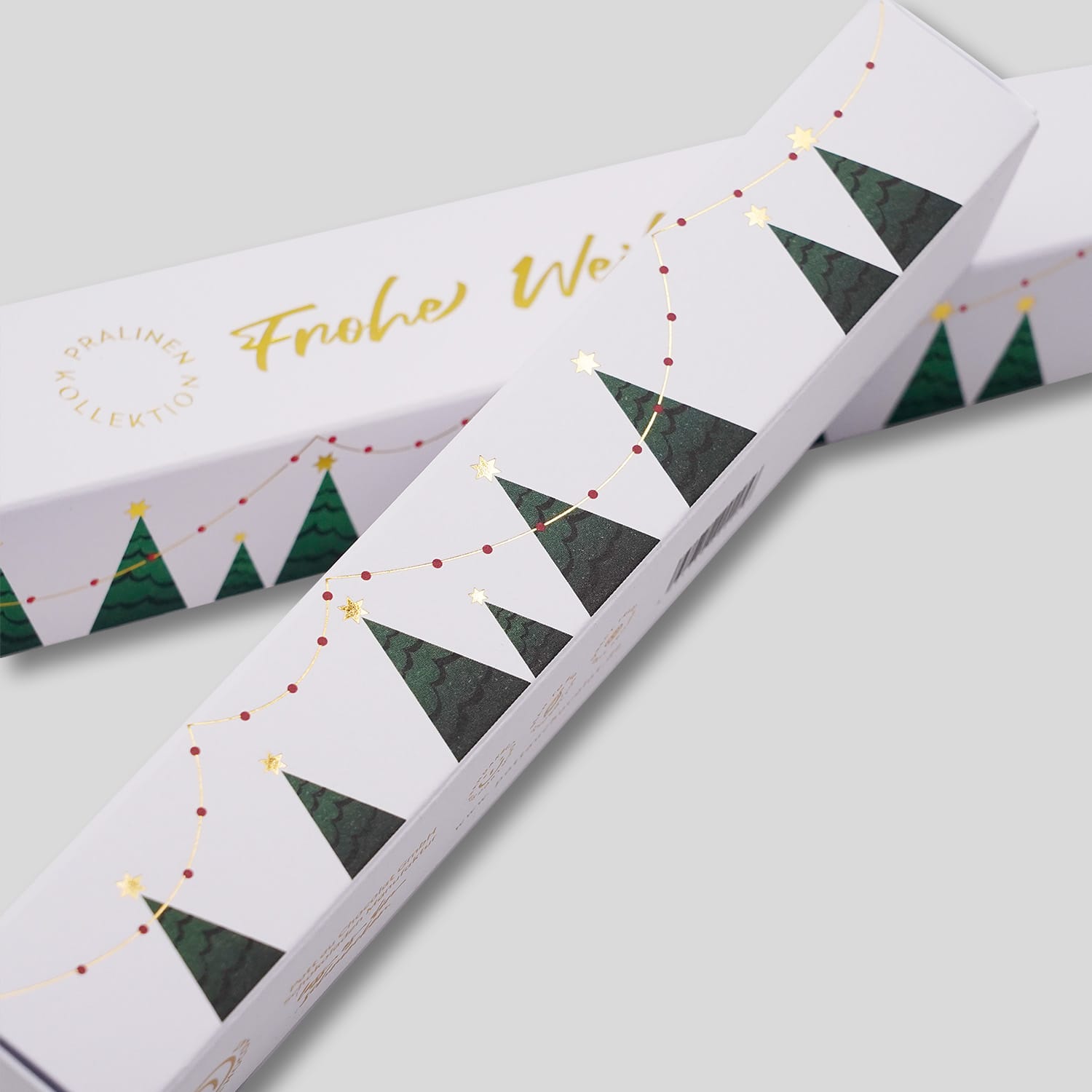 Für die Pralinen in unserer Weihnachtsedition verwenden wir nur die besten Zutaten. Jede Praline wird aus hochwertigen Kakaobohnen, feinster Schokolade und sorgfältig ausgewählten Füllungen gefertigt. Die Weihnachtsvariante hebt die traditionelle Schokoladenkunst auf ein neues Niveau, indem klassische winterliche Aromen wie Zimt, Vanille oder kandierte Früchte integriert werden. Dadurch wird der Genuss der Pralinen-Stange zu einem Erlebnis, das perfekt in die Weihnachtszeit passt und an die traditionellen Aromen erinnert, die wir aus unserer Kindheit kennen.