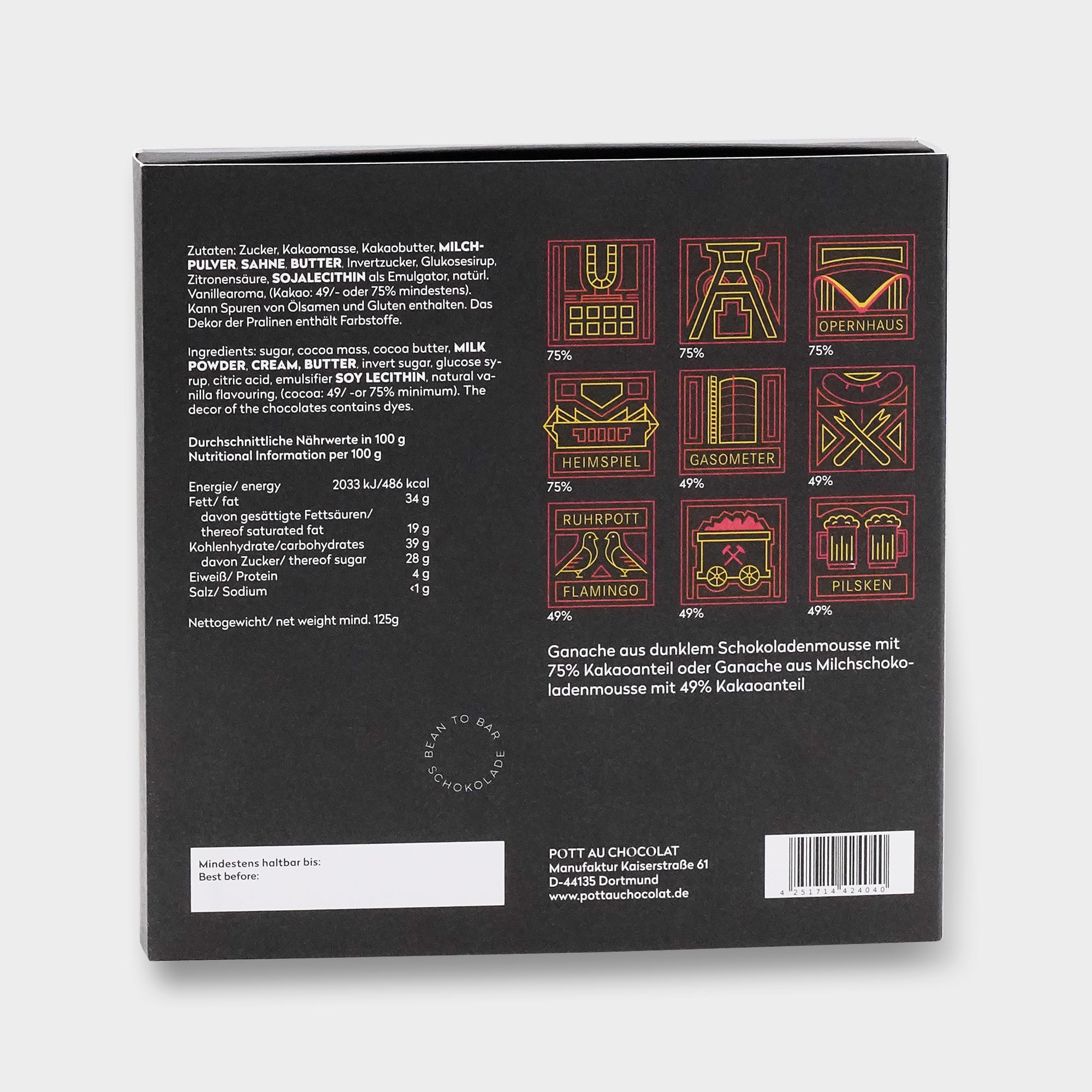 Mit ihrer Kombination aus traditionellen Ruhrpott-Symbolen und moderner Schokoladenkunst ist diese Edition eine Hommage an eine Region, die für ihren Charme, ihre Menschen und ihre Geschichte bekannt ist. Und weil jede Praline mit einem anderen Motiv bedruckt ist, wird das Verschenken oder Teilen dieser Box zu einem ganz besonderen Erlebnis – du wirst sicher viele Geschichten zu erzählen haben, wenn du die Illustrationen erklärst.