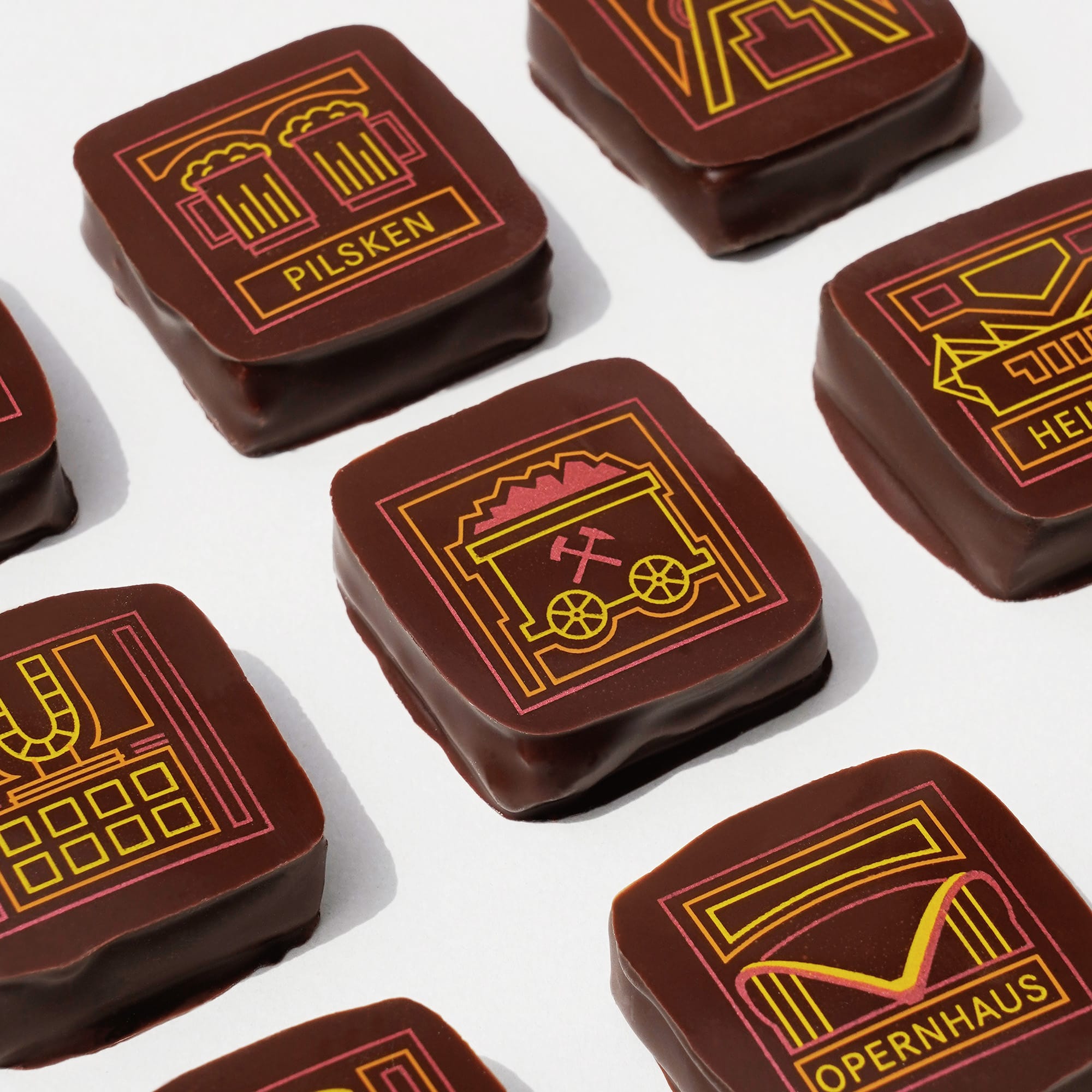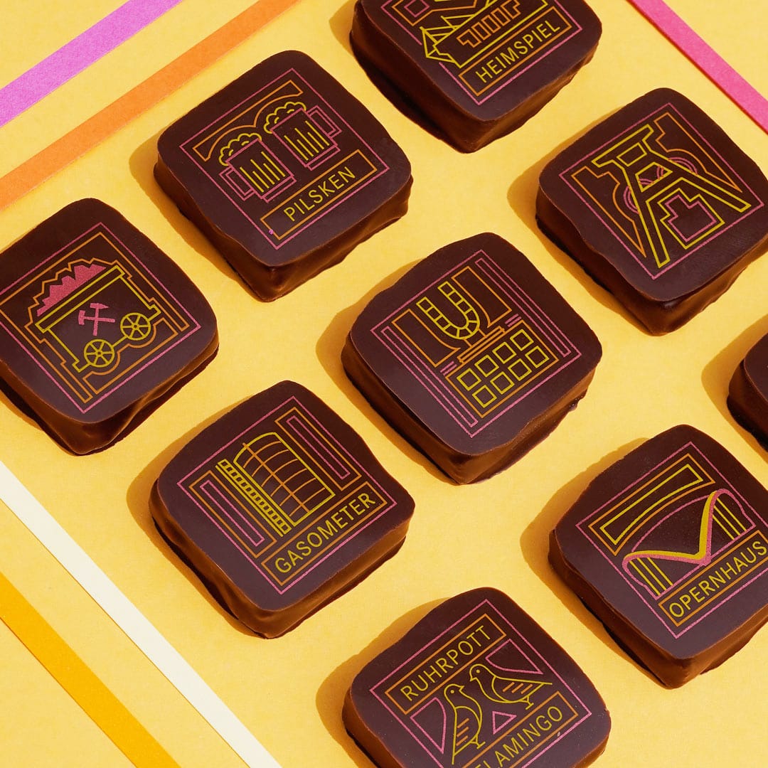 Was diese Pralinen-Edition so einzigartig macht, ist die Verbindung von Kunst und Genuss. Jede Praline ist mit einem Ruhrgebiets-Motiv bedruckt, das die besondere Kultur dieser Region widerspiegelt. Unsere talentierte Grafik-Designerin hat speziell für diese Edition eine Auswahl prägnanter Motive entworfen, die Denkmäler und Wahrzeichen des Ruhrpotts zeigen. Diese Illustrationen sind nicht nur dekorativ, sondern erzählen Geschichten – vom industriellen Erbe bis hin zur lebendigen Gegenwart.