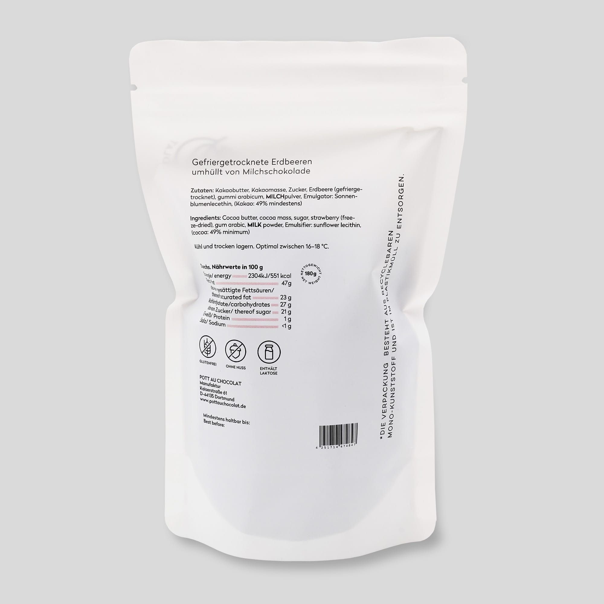 Die Schokolade, die wir verwenden, wird aus Kakaobohnen, Vollmilchpulver und einem Hauch von Zucker hergestellt. Diese Mischung ergibt eine Milchschokolade, die besonders cremig und vollmundig ist. Wir setzen auf natürliche Zutaten und verzichten auf künstliche Aromen und Konservierungsstoffe. Dadurch garantieren wir Dir einen natürlichen Genuss ohne unnötige Zusätze. Zudem verwenden wir Gummi Arabicum, eine natürliche Substanz, um die Schokoladenhülle zu stabilisieren und ein Ankleben an den Fingern zu verhindern.