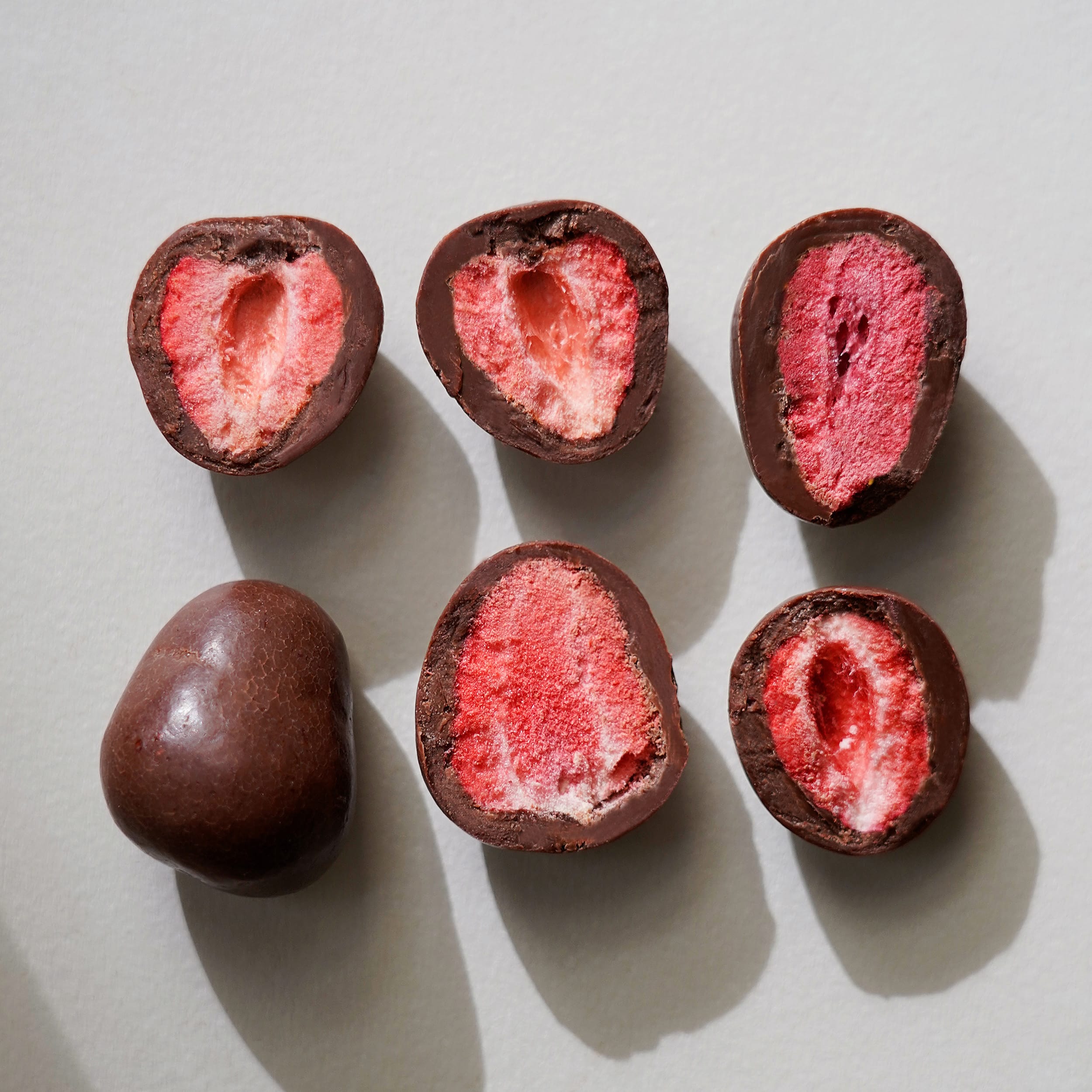 Ein großer Vorteil der Gefriertrocknung ist, dass die Erdbeeren durch den Entzug der Feuchtigkeit besonders leicht und knusprig werden. Gleichzeitig bleibt der Geschmack der frischen Frucht vollständig erhalten, was die gefriergetrockneten Erdbeeren zu einer idealen Grundlage für unsere Schoko-Erdbeeren macht.