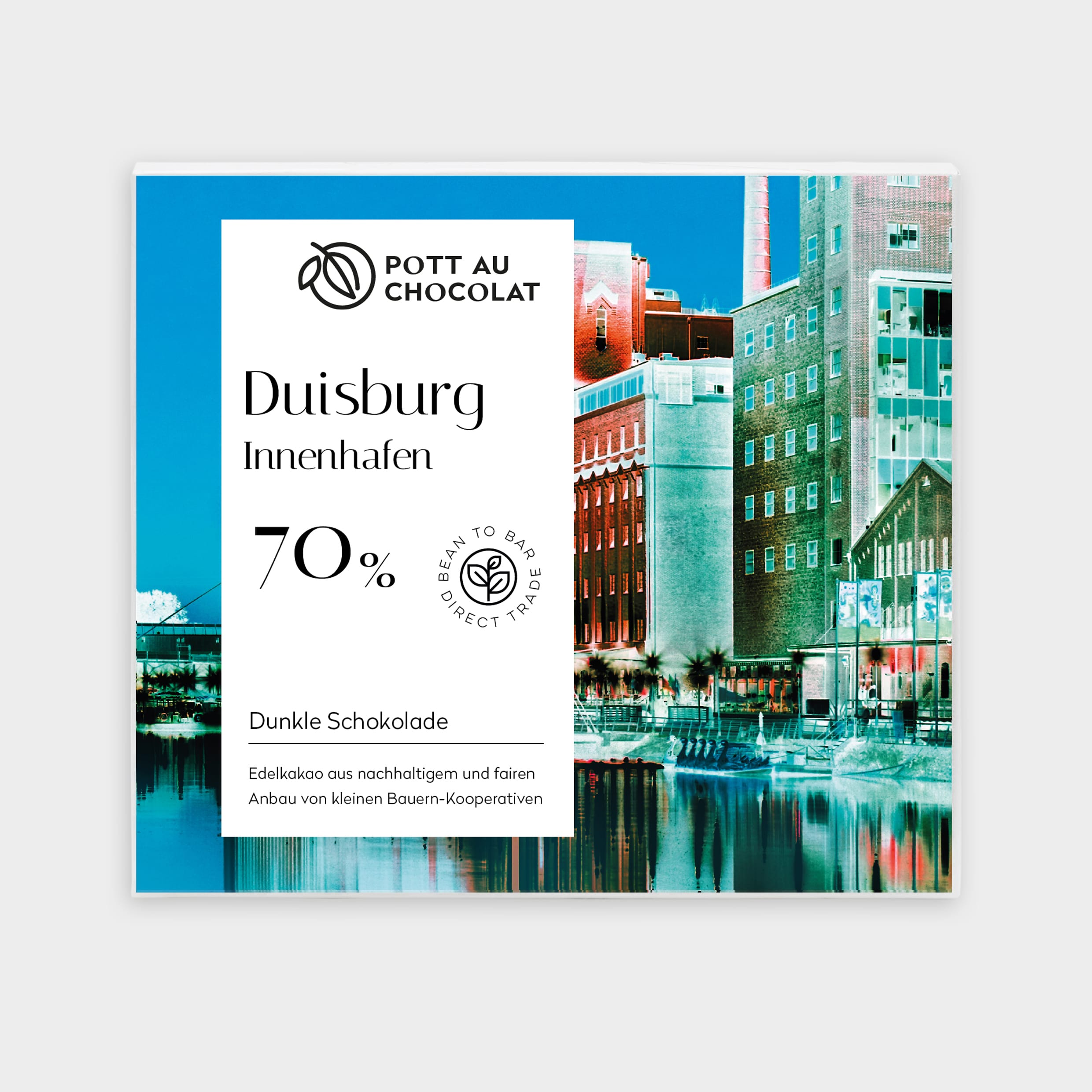 Unsere 70% Dunkle Schokolade ist für Liebhaber kräftiger Aromen. Mit ihrem hohen Kakaoanteil bietet sie ein tiefes, intensives Geschmackserlebnis, das die reichhaltigen, leicht herben Noten des Kakaos voll zur Geltung bringt. Die Schokolade ist kraftvoll und vielschichtig – genau wie der Innenhafen Duisburg, der Geschichte und Moderne in einem einzigartigen städtischen Raum vereint. Diese Schokoladenvariante ist perfekt für alle, die den puren Kakaogenuss in seiner edelsten Form schätzen.
