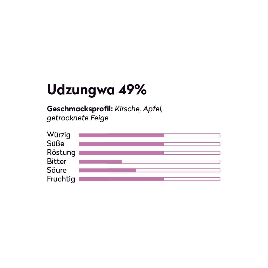 Dieser rare Trinitario Kakao aus dem Udzungwa National Park in Tansania schmeckt fruchtig - nach Kirschen und roten Äpfeln, aber auch nach getrockneten Feigen und Rosinen - er vereint warme Noten von Orange und Toffee. Kakao aus direktem Handel. From Bean to Bar.