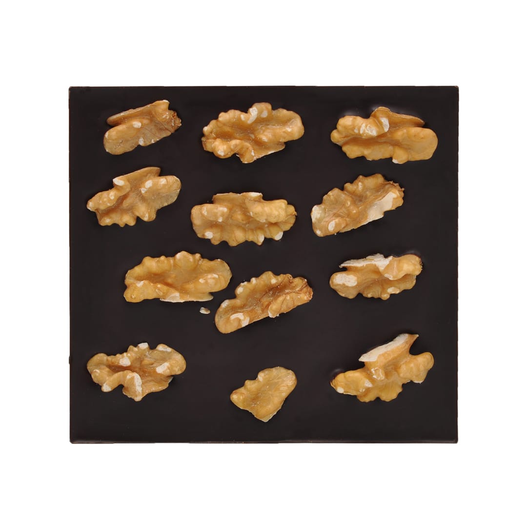 Um dieser dunklen Schokolade eine besondere Note zu verleihen, haben wir sie mit ausgewählten Walnüssen aus Chile belegt. Diese Walnüsse sind bekannt für ihren milden, leicht süßlichen Geschmack, der sich angenehm von den oft bitteren europäischen Walnüssen abhebt. Die chilenischen Walnüsse bringen eine sanfte Nussigkeit in die Schokolade, die perfekt mit den kräftigen, herben Kakaonoten harmoniert.